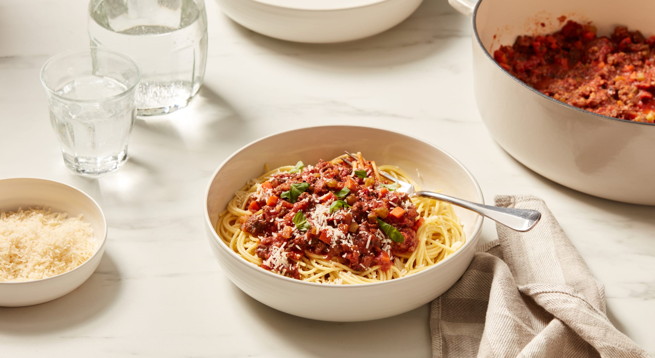 - To serve, place pasta in a shallow bowl or plate and top with Bolognese sauce. Sprinkle with Parmesan and garnish with remaining basil. Enjoy!