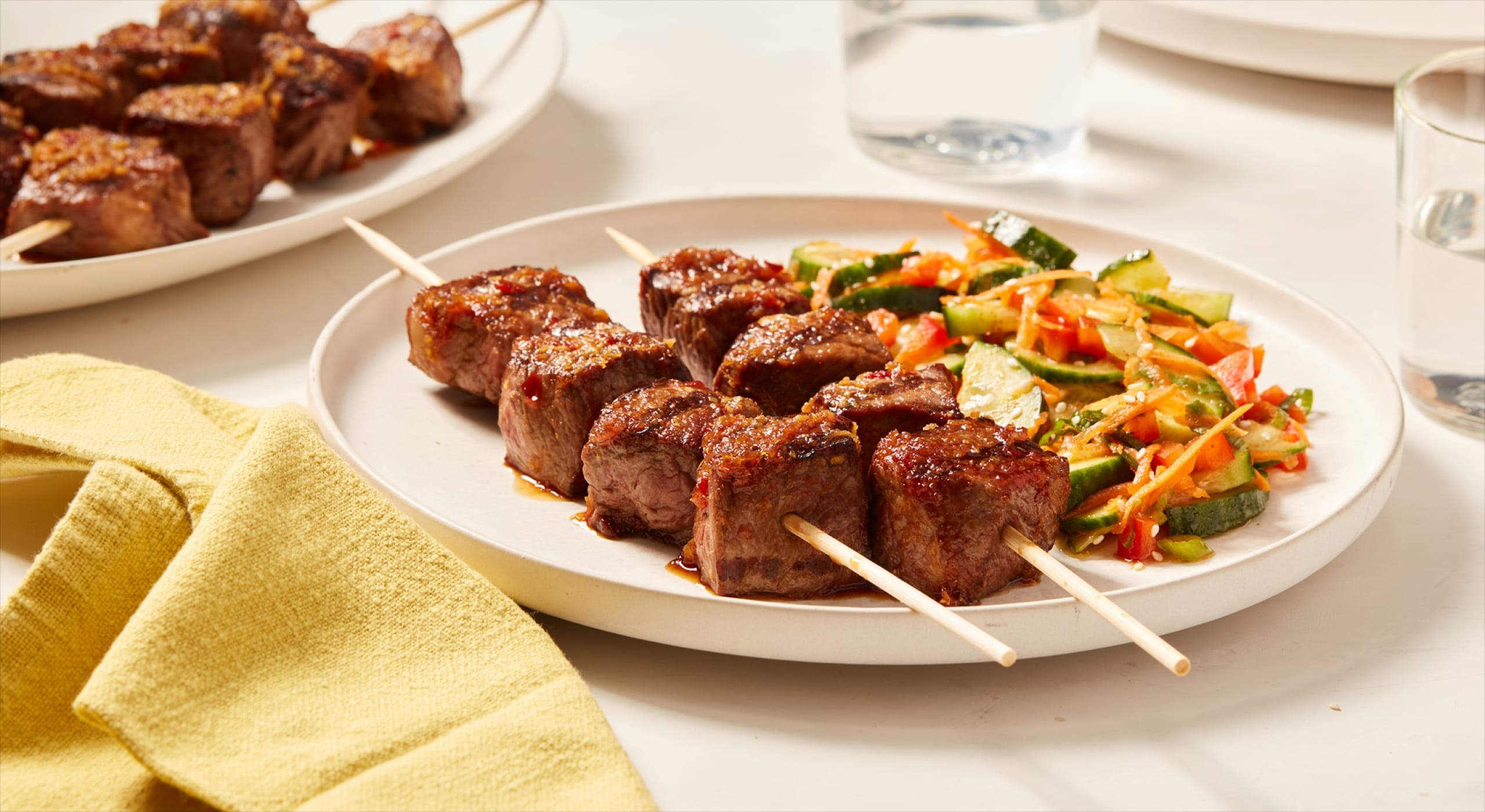 - While the grill pan heats up, thread steak onto skewers and place on a plate, reserving marinade for later use. (If you don't have skewers, you can cook the steak directly on the grill pan.)