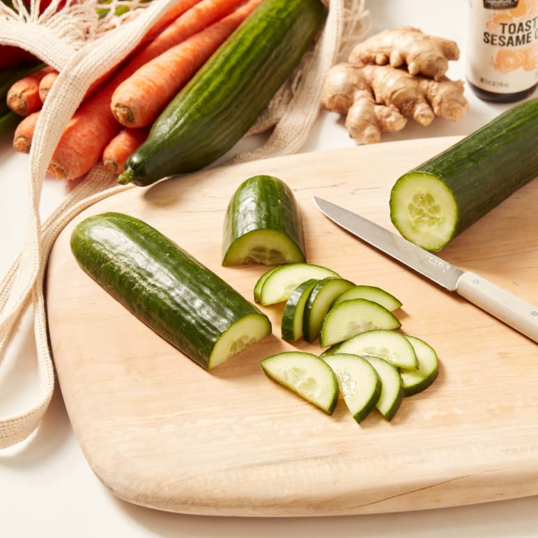 - Using a clean cutting board, trim and halve cucumber lengthwise, then slice crosswise into thin half-moons; add to the bowl with the dressing.