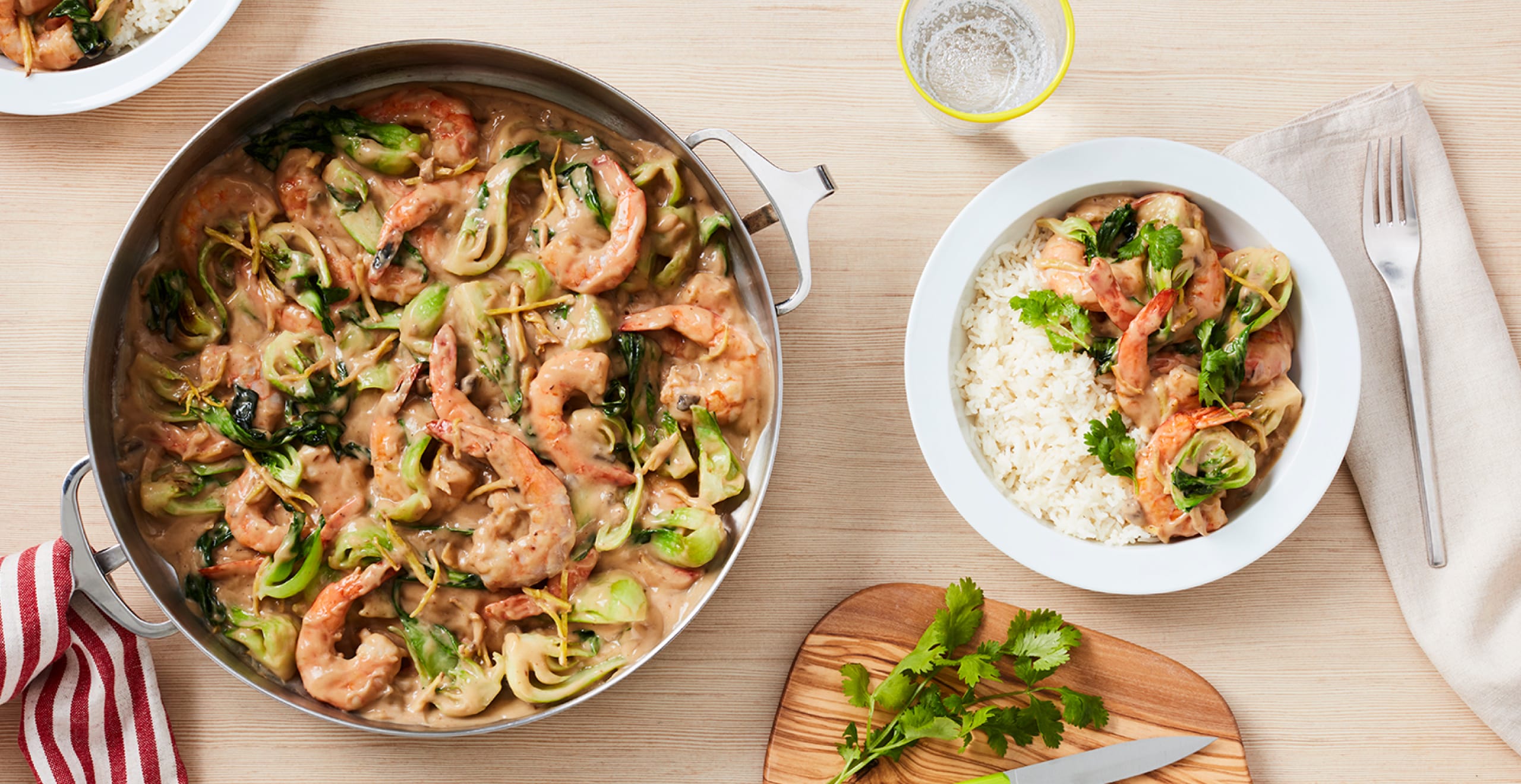 - Lower the heat to simmer until the shrimp are fully cooked and the bok choy is tender, about 3 more minutes. Serve topped with cilantro and over rice, if desired.