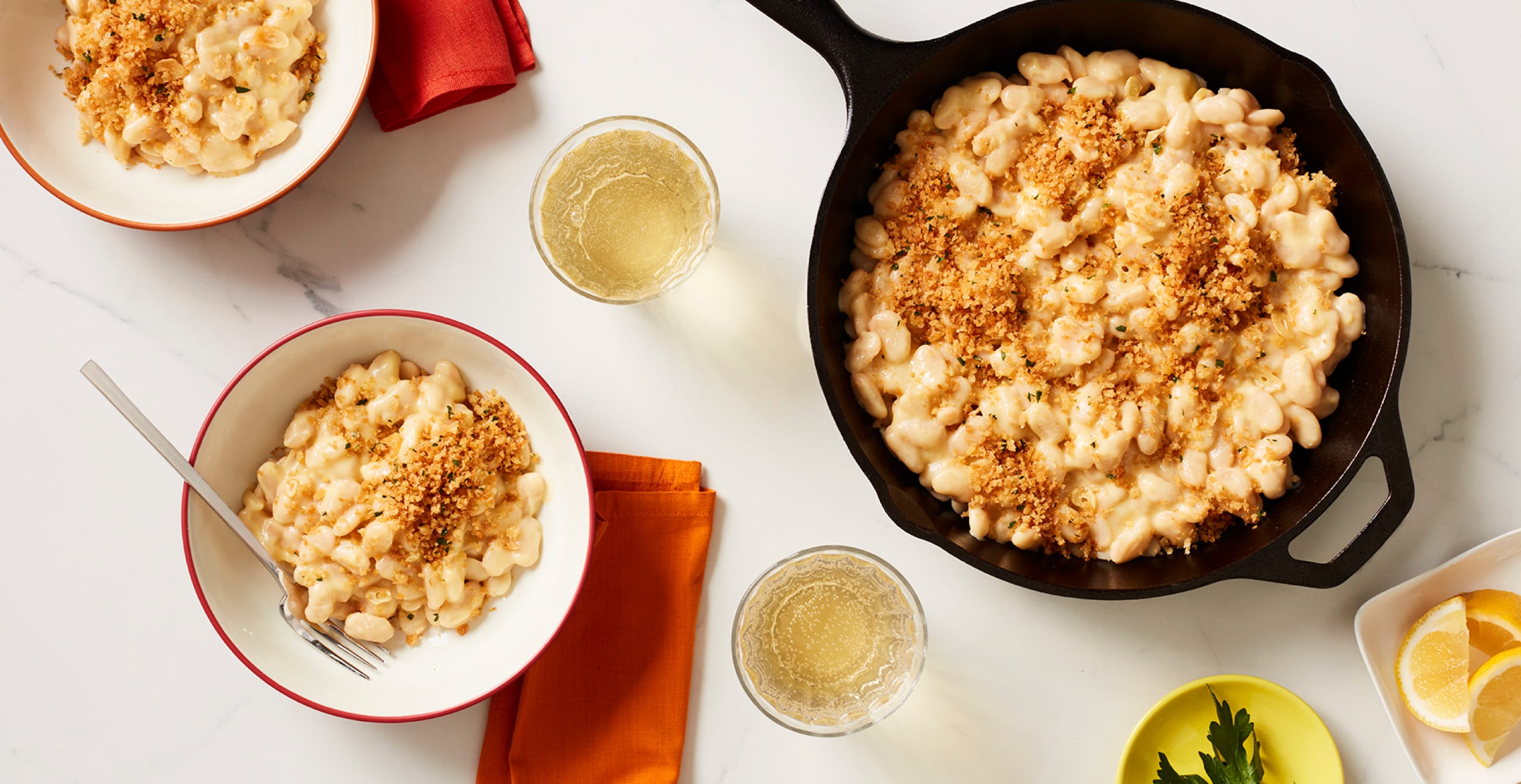 - Turn off the heat and add the cheese, stirring until melted. Sprinkle the panko mixture over the top of the beans, and serve.