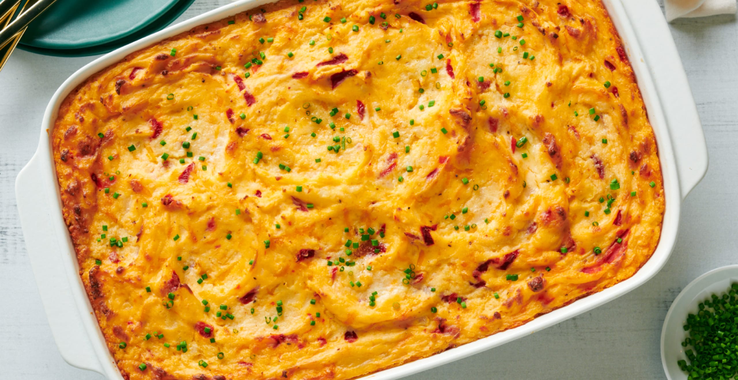These super-flavorful mashed potatoes are inspired by Southern-style pimento cheese, with sharp cheddar, sweet pimientos and tangy cream cheese and sour cream. Campbell’s® Condensed Cheddar Cheese Soup keeps everything creamy and rich. This recipe is made ahead of time and popped in the oven right before serving, eliminating the stress of mashing potatoes at the last minute.